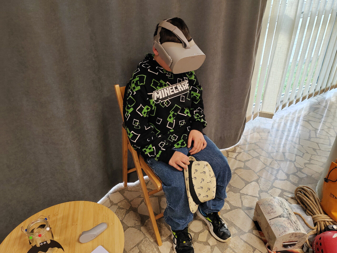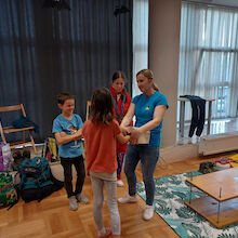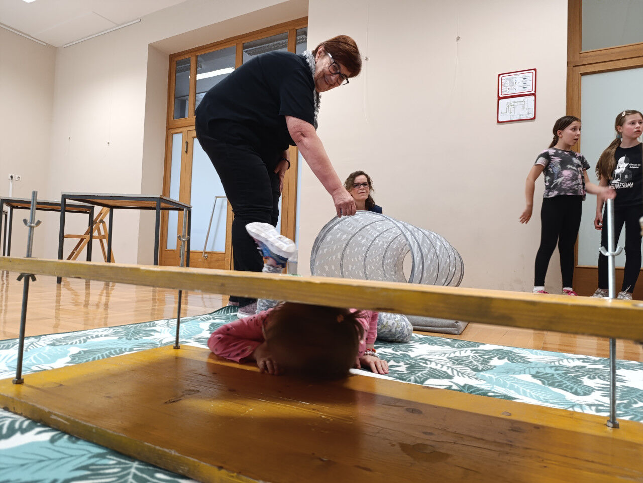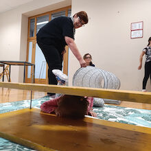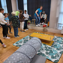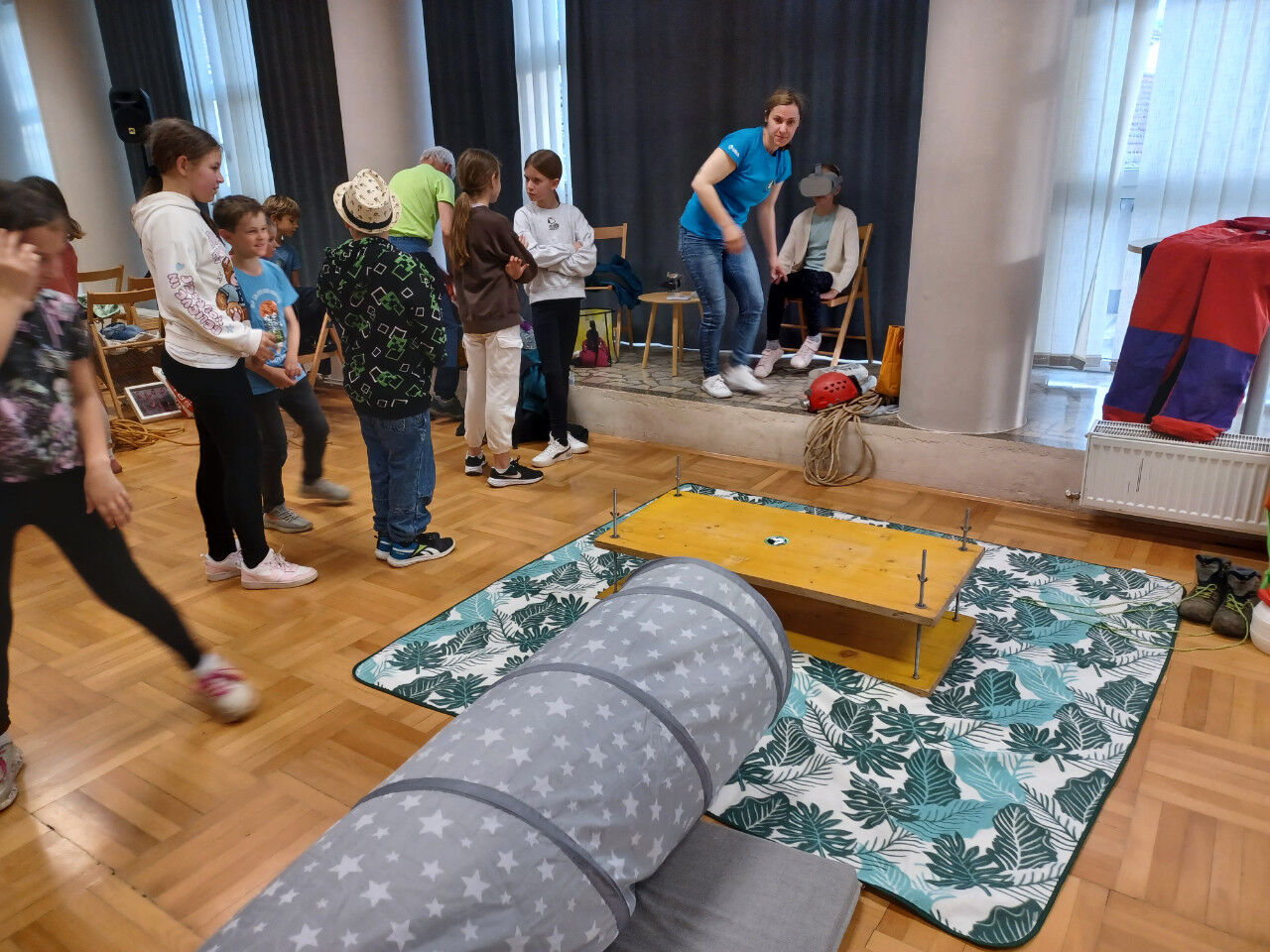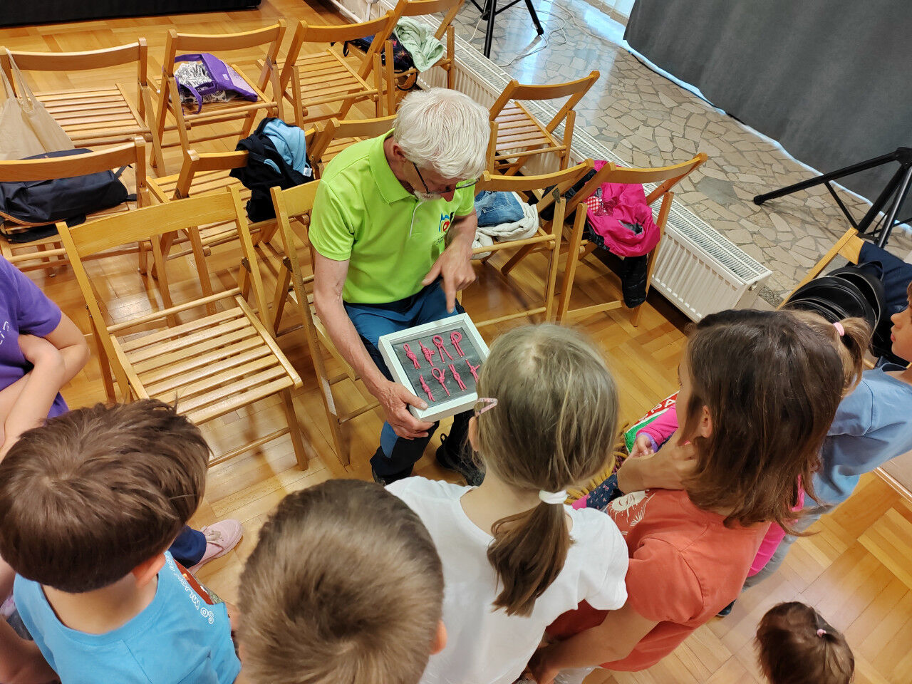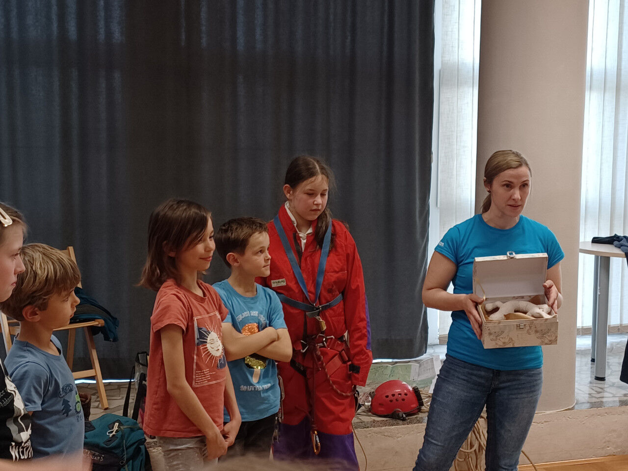 Po kratkem uvodu z zgodbo o dveh kresničkah, ki sta se izgubili v jami in seveda srečno našli izhod iz nje, nam je Tanja predstavila opremo, ki jo potrebujemo pri varnem raziskovanju jam. Otroci so uživali in z veseljem sodelovali na poligonu, kjer so plezali skozi ozko cev in skozi ožino med dvema deskama. Skozi posebna očala so si ogledali 3D film o jami, kar je bilo tudi posebno doživetje.